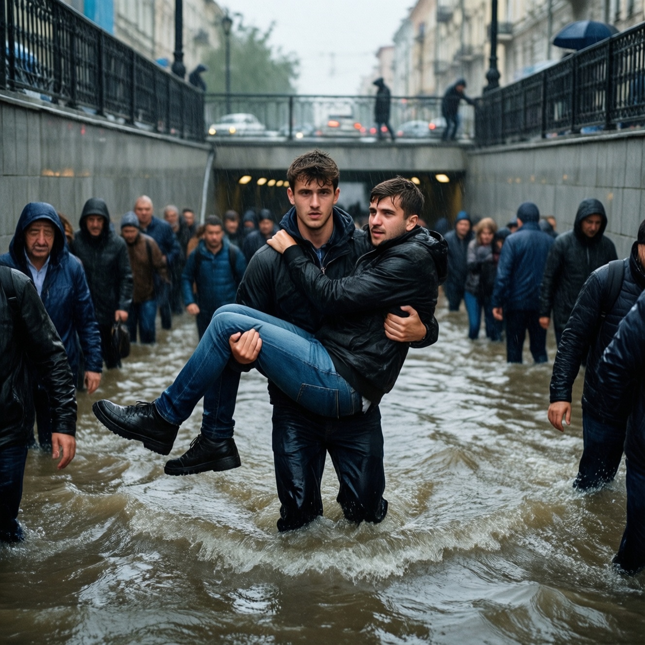 Ситуация развивалась стремительно: мощный поток заполнил переход, и многие оказались заблокированы внизу - среди них были испуганные прохожие, которым требовалась помощь, чтобы подняться по скользким ступеням и выбраться наружу. Шамиль не растерялся. Он заходил в воду снова и снова, поддерживал людей, подхватывал тех, кто уже терял силы, и помогал им добраться до безопасного места.